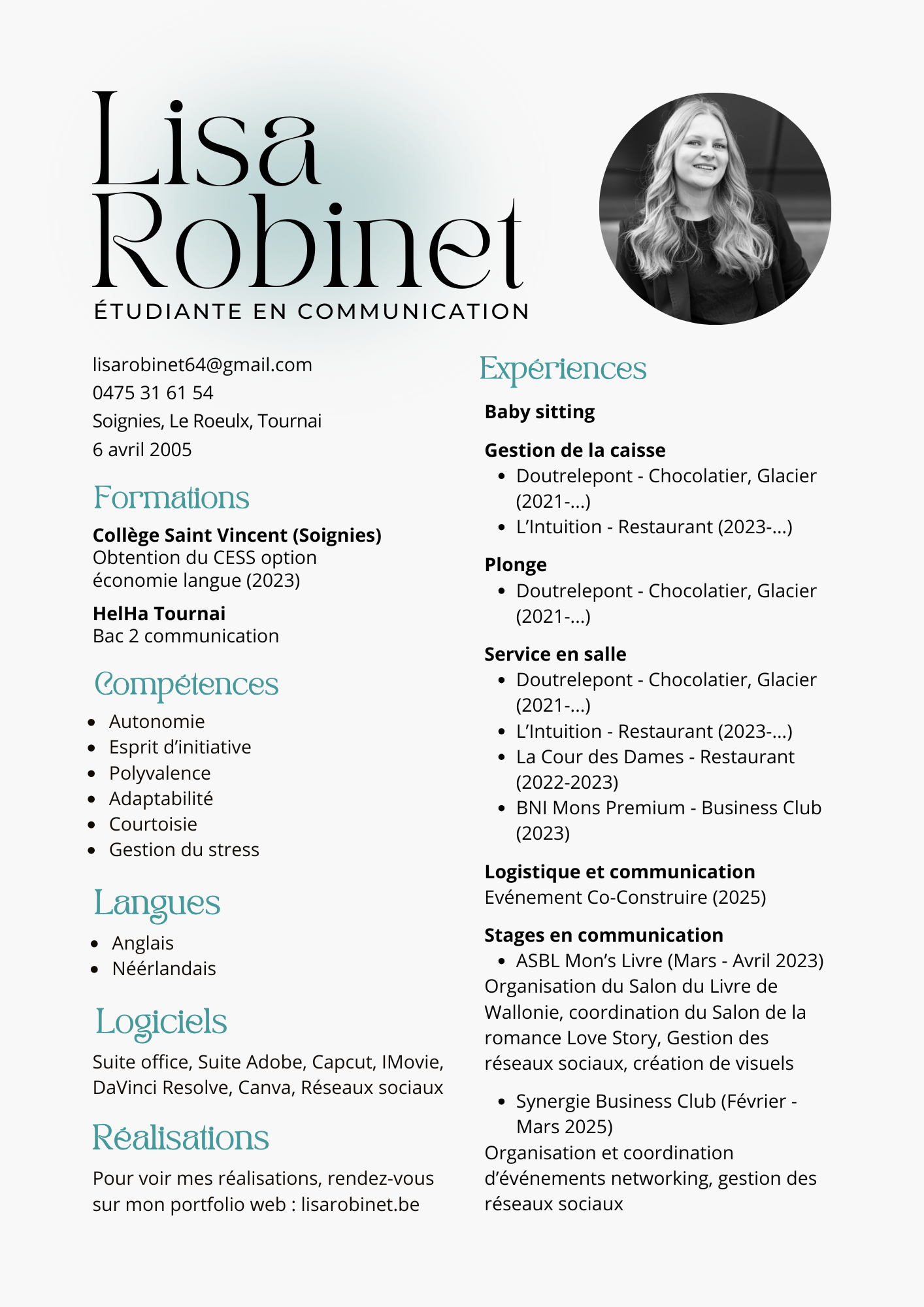 Mail lisarobinet@contact.be Téléphone +32 475 31 61 54 LinkedIn https://www.linkedin.com/in/lisa-robinet-0b1ba82b5/